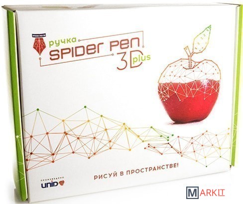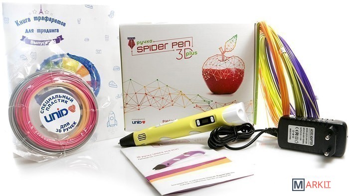Комплектация - 3D ручка Spider Pen PLUS;- Блок питания;- Демо-комплект пластика 10 метров ABS;- Промо-комплект пластика 30 метров PLA;- Инструкция на русском языке$- Книга трафаретов.
