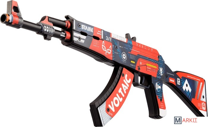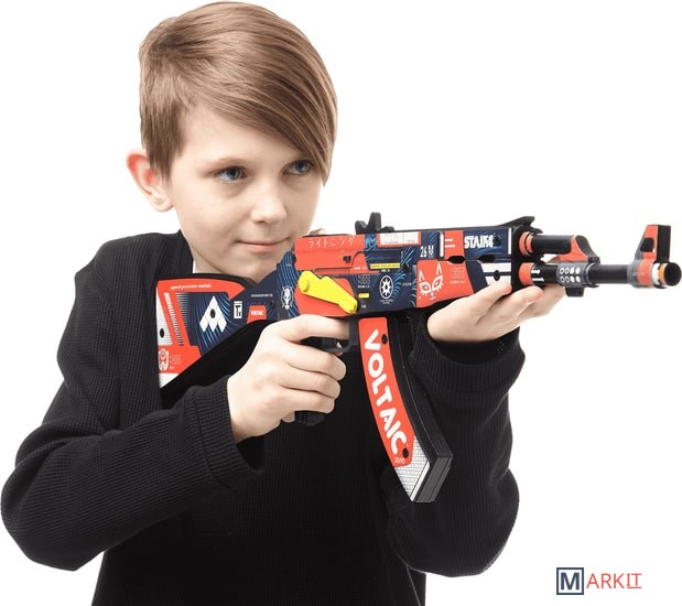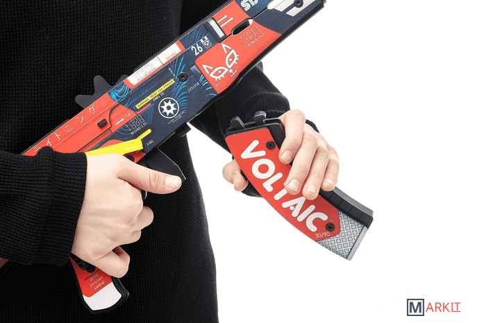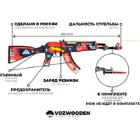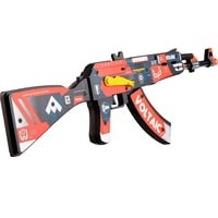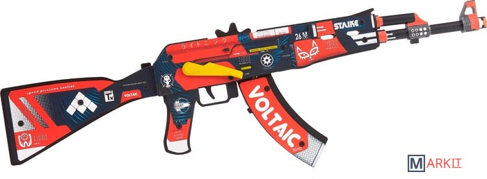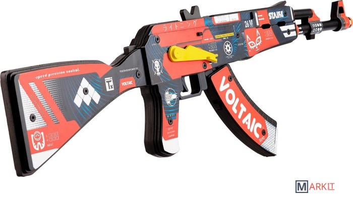 Автомат Калашникова признан чуть ли не самым популярным оружием CS:GO за всю историю существования игры Counter Strike. И это не случайно. Сверхмощная винтовка покорила сердца миллионов своей эффективностью и дальностью стрельбы по противникам. Но то — виртуальный мир, а в жизни настоящий АК-47 – это конкурсная работа автора. В боевую эксплуатацию была внедрена уже доработанная модель АК-49.Тем не менее, наша сверхмощно проработанная деревянная копия АК-47 совершенно реальна и эффективна в «бою», как и контрстрайковская. И если вы читаете эти строки, значит, уже знаете, чем занять себя в свободное от учебы или работы время. И наш деревянный резинкострел – именно то, что нужно.Калаш снабжен съемным магазином, у него выдвигается приклад, закругленное дуло – все, как у настоящего! Стреляет очередями резинками на расстояние аж до 15 м. Рекомендуем заряжать единовременно от 2 до 20 штук. В этом случае вы можете не беспокоиться за целостность механизмов. Также у АК есть крепление под штык-нож. Но сам нож в комплект не входит. Его можно купить отдельно.К примеру, скин Кровавый спорт (Bloodsport) — один из самых популярных скинов для данного типа оружия, но из-за высокой стоимости он редко встречается в игре. Корпус выполнен в красных, серых и белых цветах. Украшен большим количеством надписей различных размеров и шрифтов. Все дополняется мелкими изображениями и пиктограммками. Смотрится реально очень круто, поэтому каждый коллекционер просто мечтает о таком автомате.Размеры автомата Калашникова: длина 68 см, высота 23 см, ширина 3,5 см. В комплекте идет 60 резинок. АК-47 разрабатывается по официальной лицензии от концерна «Калашников»
