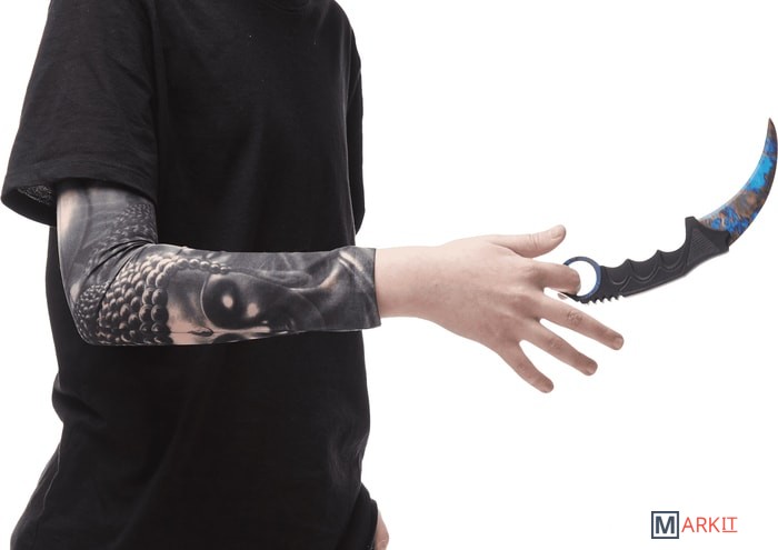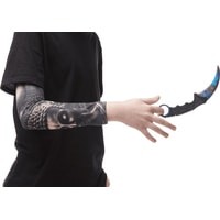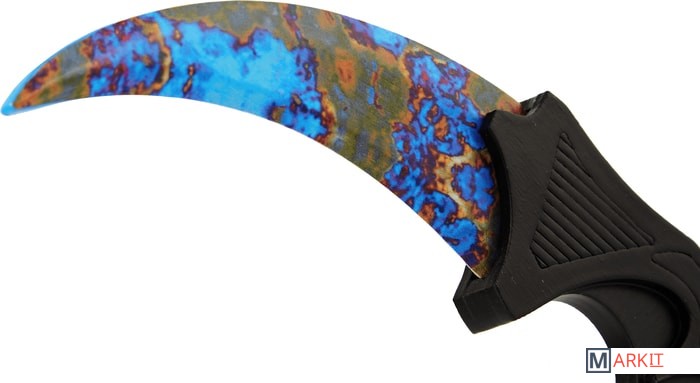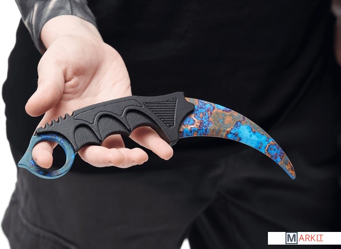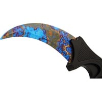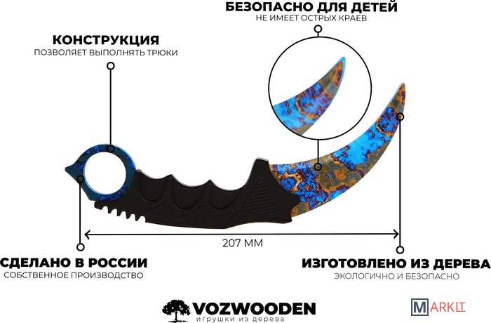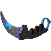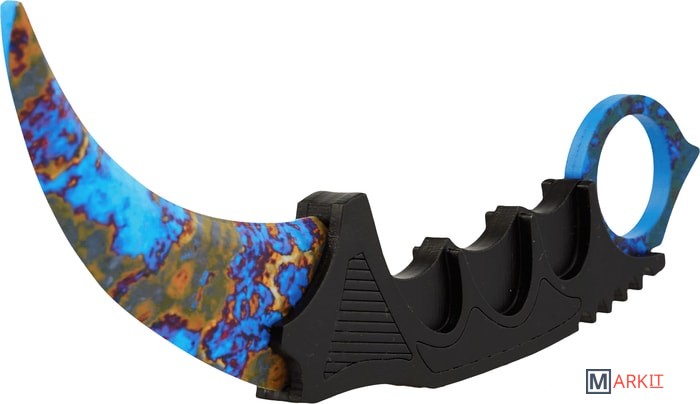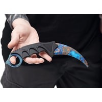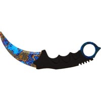 Форма ножа керамбит однозначно является крайне интересной. Неудивительно, что создатели CS:GO уделили ей такое внимание. Изначально это оружие появилось в Малайзии, а чтобы научиться владеть им как следует, необходимо затратить годы. Все дело в нестандартном клинке, который имеет обратный загиб и напоминает тигриный коготь. Впрочем, опытные бойцы могут нанести им два пореза за один удар, что говорит о некоторых преимуществах керамбита перед стандартными ножами.Наша деревянная реплика, созданная по образу и подобию оружия из Counter Strike, нестандартна вдвойне. Помимо формы ножа, крайне интересен его принт Поверхностная Закалка (Case Hardened). Узор из различных оттенков синего, желтого и фиолетового формирует гипнотизирующее буйство красок и выглядит завораживающе. Неудивительно, что одноименный скин так полюбился фанатам Counter Strike.Вес керамбита составляет 30 г. Длина 20.7 см, высота 6.7 см, толщина 1.2 см.