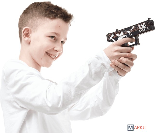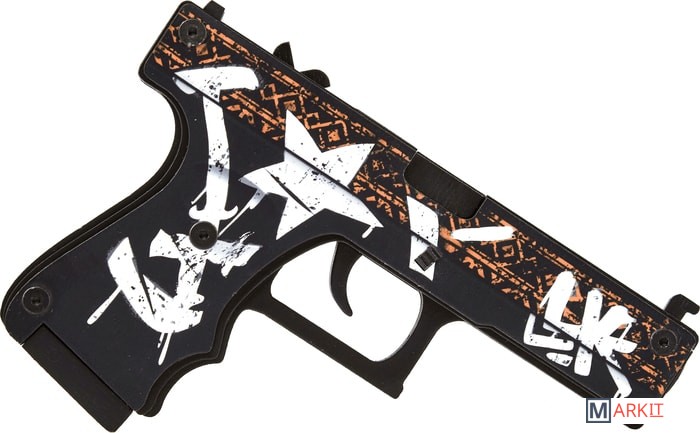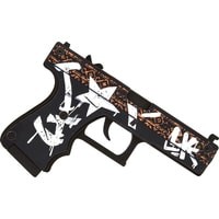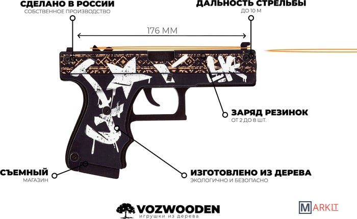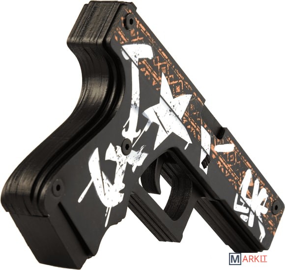 Есть тут те, кто любит Counter Strike? Представляем вам оружие первое раунда игры команды террористов – Glock-18. Интересно, что в жизни серия Glock используется правоохранительными органами и вооруженными силами. Тем не менее, в Counter-Strike Glock-18 является пистолетом террористов по умолчанию.Мы не являемся производителями реального оружия, мы делаем его деревянные аналоги. Они безопасны для игр, ведь стреляют резинками. Но даже знатоки скажут, что дальность стрельбы в 10 м. – ого-го, как круто! Во избежание поломки механизмов, на секундочку, очень прочно скрепленных болтами, заряжайте единовременно ваш глок от 2 до 8 резинок. Для «патронов» используйте выдвижной магазин. Все как в реале!Все деревянные резинкострелы серии CS:GO полностью повторяют скины из игры. Любителей Пустынного Повстанца (Wasteland Rebel) порадует точность нанесения рисунка. Совсем как в Counter Strike — бежевый этнический принт и граффити Kill them all украшают черный корпус пистолета. Очень органично смотрится искусственное состаривание изображения.Размеры игрушки: Длина 17.6 см, высота 12 см, ширина 2,4 см. В комплекте идет 20 резинок.