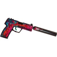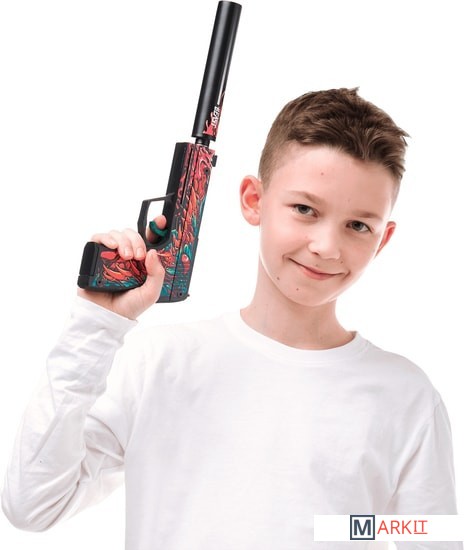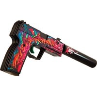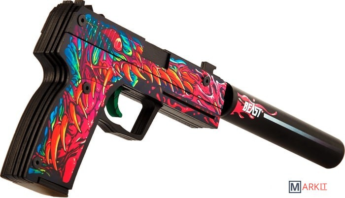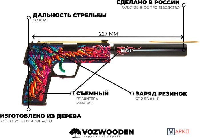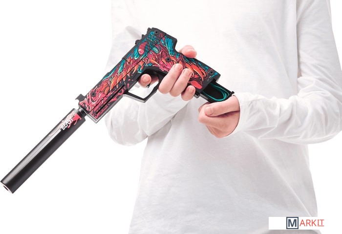 В самом начале игры Counter strike каждый игрок получает первое оружие. Если вы выбрали команду спецназа, то вам выдается пистолет USP-S со съемным глушителем. Теперь мы можете купить и стать обладателем такой штуковины не только в игре, но и в жизни. Мы создаем высококачественные аналоги игрового оружия из натурального дерева. Они обладают теми же свойствами, что и настоящие, но при этом безопасные для игр во дворе.Деревянный резинкострел ЮСП оснащен съемным глушителем, у него выдвигается магазин, в котором прекрасно помещается запасной комплект боеприпасов. Все детали пистолета крепятся надежными болтами, что гарантирует долговечность и качество оружия. Пистолет стреляет резинками на расстояние до 10 м одиночными выстрелами. Только постарайтесь не заряжать резинкострел одновременно более, чем 8 резинками, иначе есть вероятность повредить механизмы игрушки. Но это не точно)Например, максимально востребованный скин в Counter Strike – Скоростной зверь (Hyper Beast). Кислотно-люминесцентный дизайн стал популярным сразу же, как только появился в серии CS:GO. На корпусе пистолета изображено устрашающее чудовище с открытой пастью и острыми зубами.С таким оружием вы будете поражать противников не только своей безупречной меткостью, но и ослепительной красотой своего хэдшотера. Только соблюдайте меры безопасности!Размеры игрушки: Длина 32,7 см, высота 13 см, ширина 2,5 см. В комплекте идет 30 резинок.