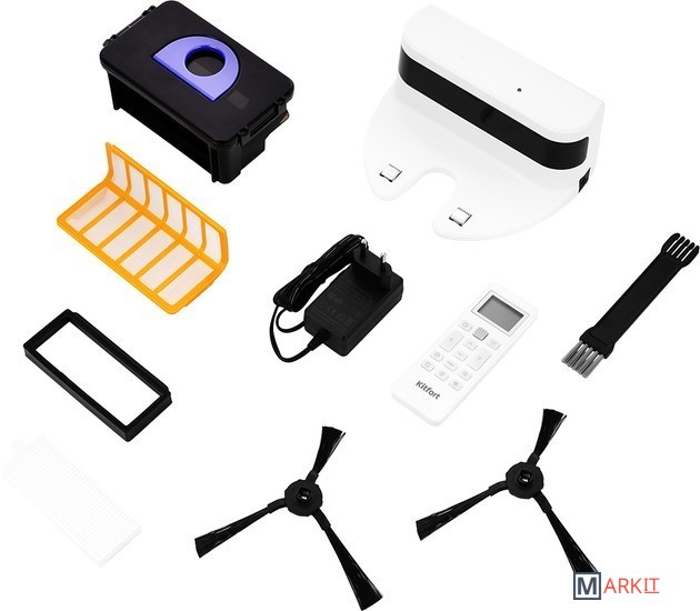 Комплектация пылесборник, боковые щётки, пульт ДУ, фильтр грубой и тонкой очистки, база, зарядное устройство и щёточка для очистки.