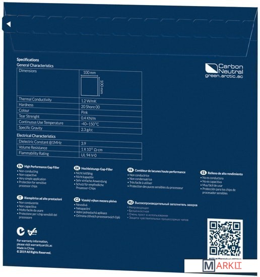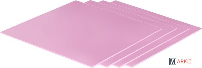 Твердость: - 35 Shore OOУдельный вес: - 2,3 г / см³Прочность на разрыв: - 0,4 кН / мДиэлектрическая проницаемость при 1 МГц: - 3,9Объемное сопротивление: 1x10^12 Ом-смРейтинг воспламеняемости: UL 94 V-0В комплекте 4 термопрокладки.